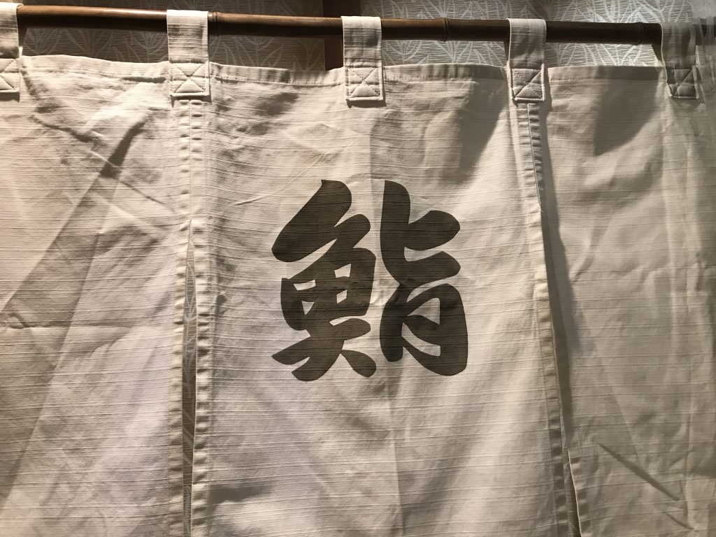 八幡鮨の店内には、お手洗いや厨房との仕切り、あるいはブラインドとしての暖簾が10枚近くもあります。