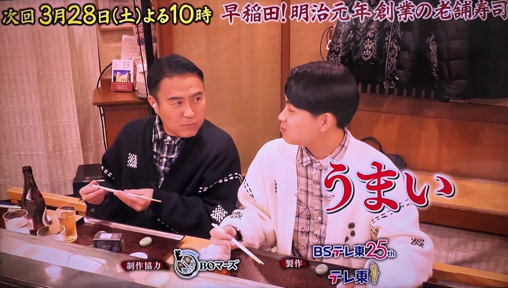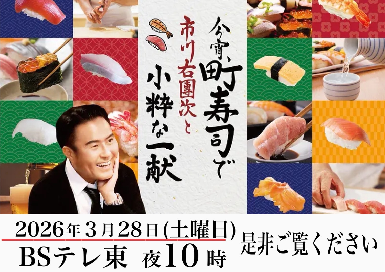 3月28日土曜日の午後10時から、BSテレ東の「今宵、町寿司で市川右團次と小粋な一献」という番組に八幡鮨も出していただくことになりました。